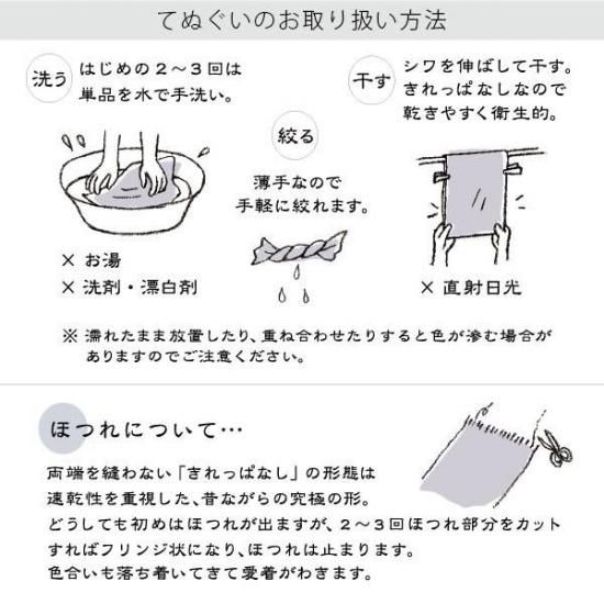 端を縫わず切りっぱなしとなった昔ながらのてぬぐいです。 ほつれは自然と止まりますので、適宜ハサミでカットしながらお使いください。