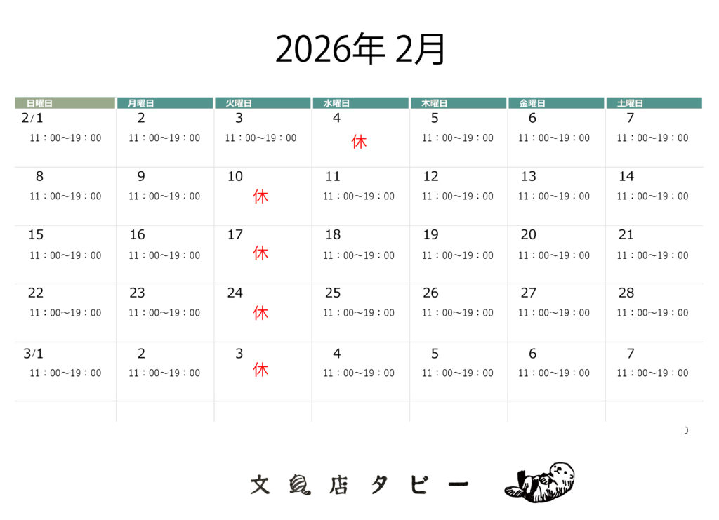 文具店タビー西荻窪店舗ならびに文具店タビーオンラインショップをご利用いただきありがとうございます。2026年2月は、4日(水)が商品展示会のためお休みです。代わりに前日3日(火)は営業いたします。それ以外の火曜以外は11時~19時の通常営業でございます。寒い日がつづきますがみなさまのご健康をお祈りしながら。2月も文具店タビーをどうぞよろしくお願いいたします。